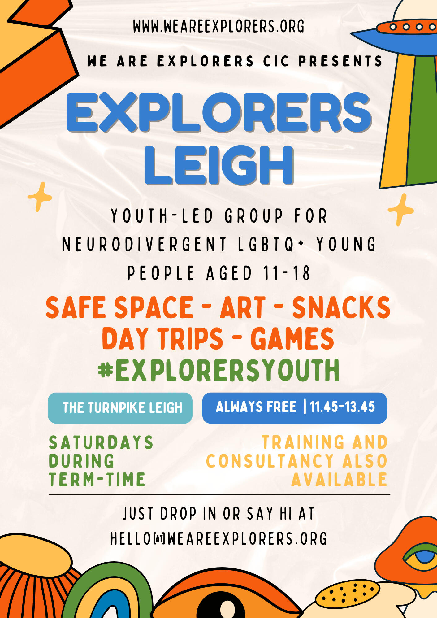What began as a small youth group is now We Are Explorers CIC: a queer, Neurodivergent-led social enterprise supporting people of all ages across Wigan and Bolton. We run social groups, offer one-to-one support, and train schools and professionals on the intersection of queerness and Neurodivergence.We exist because queer spaces often exclude Neurodivergent people — and Neurodivergent spaces often overlook queer identities. But 1 in 4 Neurodivergent people in the UK are LGBTQ+, and we deserve spaces where we don’t have to choose which parts of ourselves to show up with.We build those spaces. Where stim toys are welcome. Where softness is strength. Where being yourself doesn’t come at the cost of burnout or masking.Because we’re not just here to help people survive.
